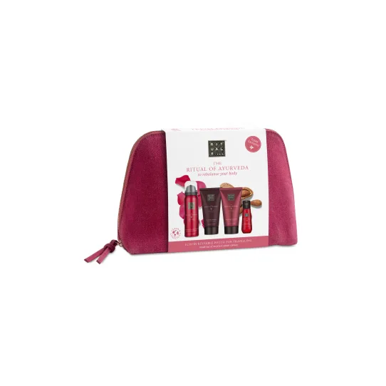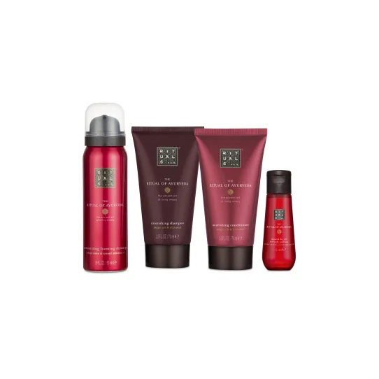 Take the harmonising power of The Ritual of Ayurveda on your travels with you. Shop The Ritual of Ayurveda travel exclusive for a treat that harmonises body, mind and soul. It contains a beautiful mini shower foam, shampoo, conditioner and dry body oil, infused with soothing Indian rose and moisturising sweet almond oil, to help you start each day in harmony. Better for the planet: Our exclusive travel pouch has a new look for 2021. Now produced with recycled cotton canvas. The set includes: • Foaming shower gel 50ml • Shampoo 70ml • Conditioner 70ml • Dry oil 30ml Rituals Ayurveda Travel Exclusives 2021, reserve online and collect from our duty free store before you travel. Explore our extensive range of beauty, liquor and food when you reserve your duty free order online. Find the main Rituals products available to purchase and reserve at airport. With up to the benefit of 1000s more products available when you reserve in advance, enjoy shopping tax and duty free products online with more choice, and without the rush! Reserve online, collect and pay in store.Take the harmonising power of The Ritual of Ayurveda on your travels with you. Shop The Ritual of Ayurveda travel exclusive for a treat that harmonises body, mind and soul. It contains a beautiful mini shower foam, shampoo, conditioner and dry body oil, infused with soothing Indian rose and moisturising sweet almond oil, to help you start each day in harmony. Better for the planet: Our exclusive travel pouch has a new look for 2021. Now produced with recycled cotton canvas. The set includes: • Foaming shower gel 50ml • Shampoo 70ml • Conditioner 70ml • Dry oil 30ml